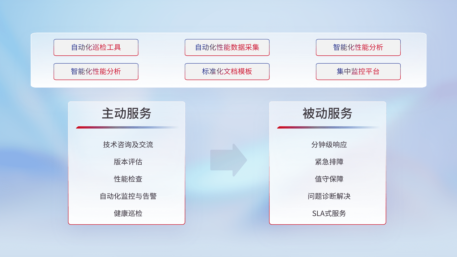 智能化工具和标准化文档,,,,保障服务质量,,提供主动服务(包含技术咨询、、版本评估、、、、性能检查、、自动化监控与告警、、、、健康巡检)和被动服务包含(分钟级响应、、、紧急排障、、值守保障、、问题诊断解决、、、、SLA服务)。。